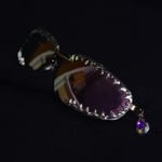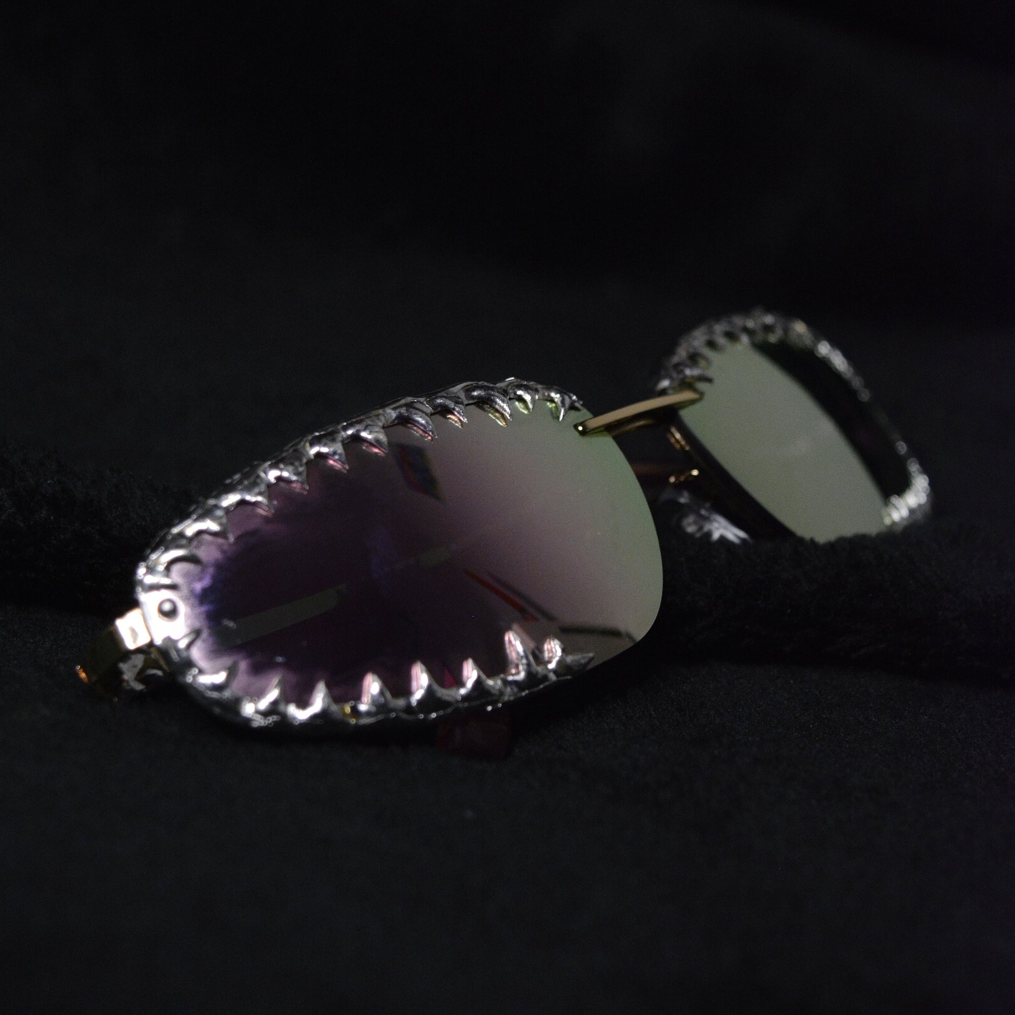 These frames feature a sharp melted metal coating, creating an organic, raw texture that feels like jewelry for the face. Paired with mirror lenses, the Alchemy Sunglasses shifts through a spectrum of vivid pinks, deep greens, and prismatic multicolor reflexes as the light moves. To complete the look, it features on the side a dangling holographic crystal that fits perfectly, catching the light with every movement.