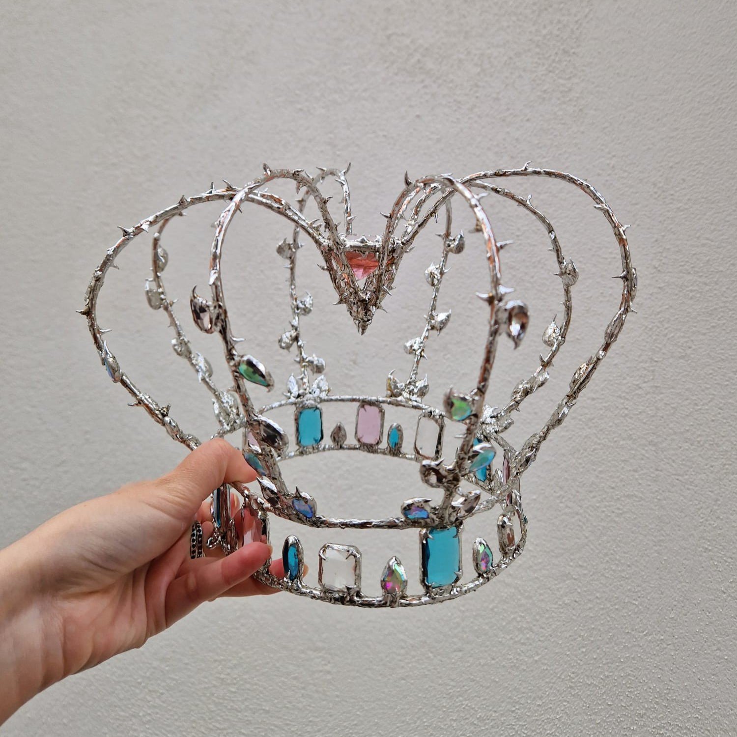 The Alien Queen Crown is a masterpiece of extraterrestrial elegance. The majestic frame is encrusted with a breathtaking pastel crystals and sharp spikes. This design balances aggressive, geometric architecture with the gentle, bioluminescent spirit of the shooting stars. It is a high-fashion statement for a ruler who commands the galaxy with grace and ethereal beauty.