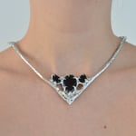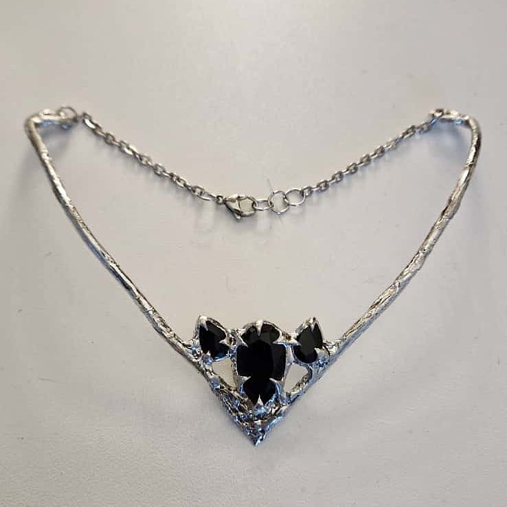 A bold yet refined piece, this rigid necklace sits elegantly at the base of the neck, its V-angle drawing the eye to three black crystals. Designed with a slight flexibility, it gently adapts to the shape of your chest, offering both structure and comfort. A balance of strength and clarity, it embodies power, harmony, and a touch of mysticism, made to move with you while making a statement.