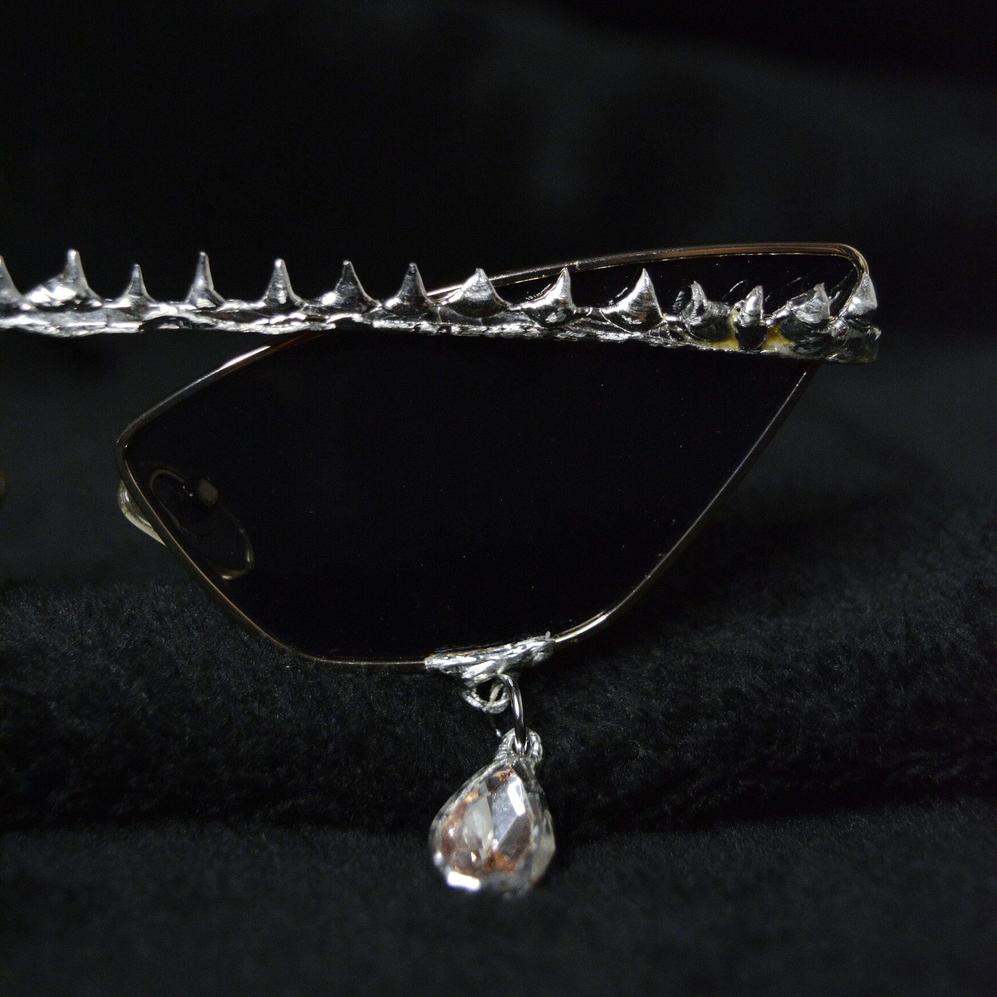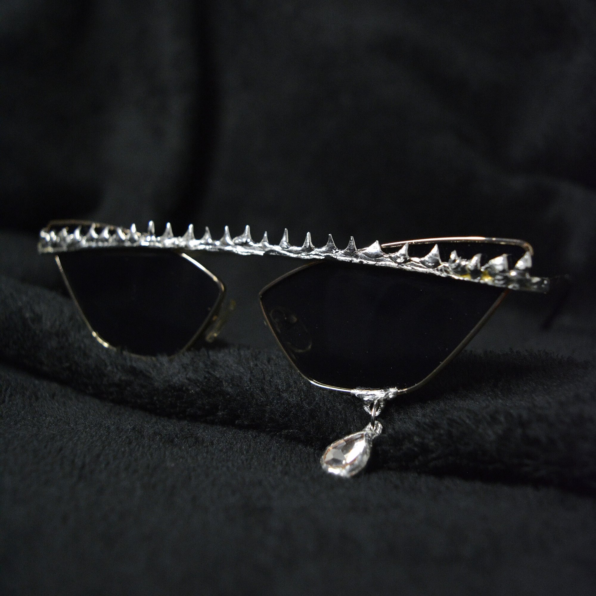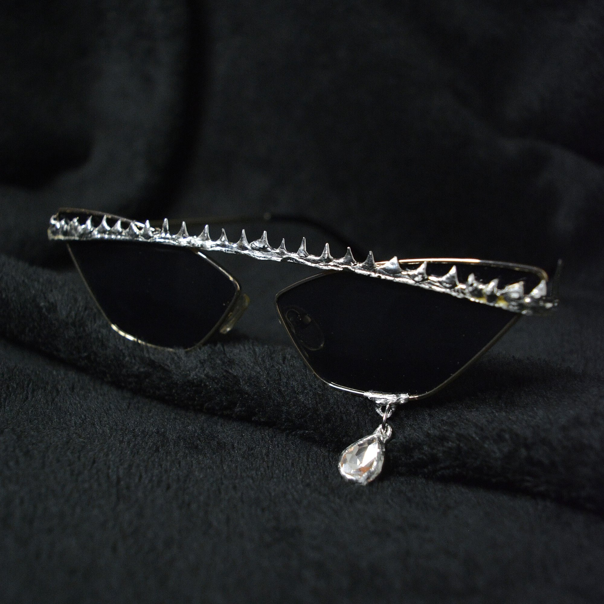 This frame redefines the cat-eye silhouette by adding a blade of metallic thorns, textured with a raw, melted metal finish. The contrast between the industrial, spiked hardware and the ethereal side detail creates a stunning visual balance. It features a dangling silver crystal that fits perfectly, adding a touch of high-fashion luxury to a punk-inspired design.