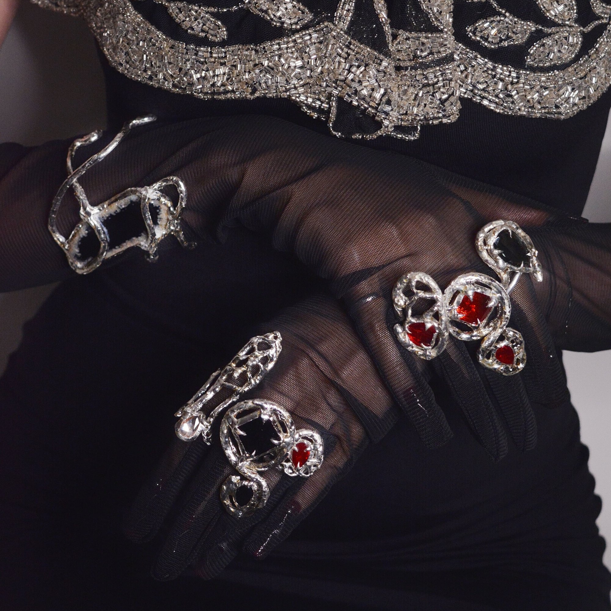 Embrace the beauty of contrasts with the Duality Ring. This striking design features a bold square crystal at the base, while a smaller teardrop-shaped crystal rests above, both encased in flowing melted metal. The intricate metal structure surrounding the stones adds depth and dimension, creating a harmonious balance between geometric shapes and organic elegance. A piece that speaks to the power of duality—strength and delicacy, simplicity and complexity.