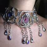 The Oracle’s Choker is a tribute to the keepers of ancient legends. Three square frames sit firmly at the base, symbolizing the pillars of the physical world. At the heart of each square lies a unique crystal, glowing with a light that feels pulled from another time.