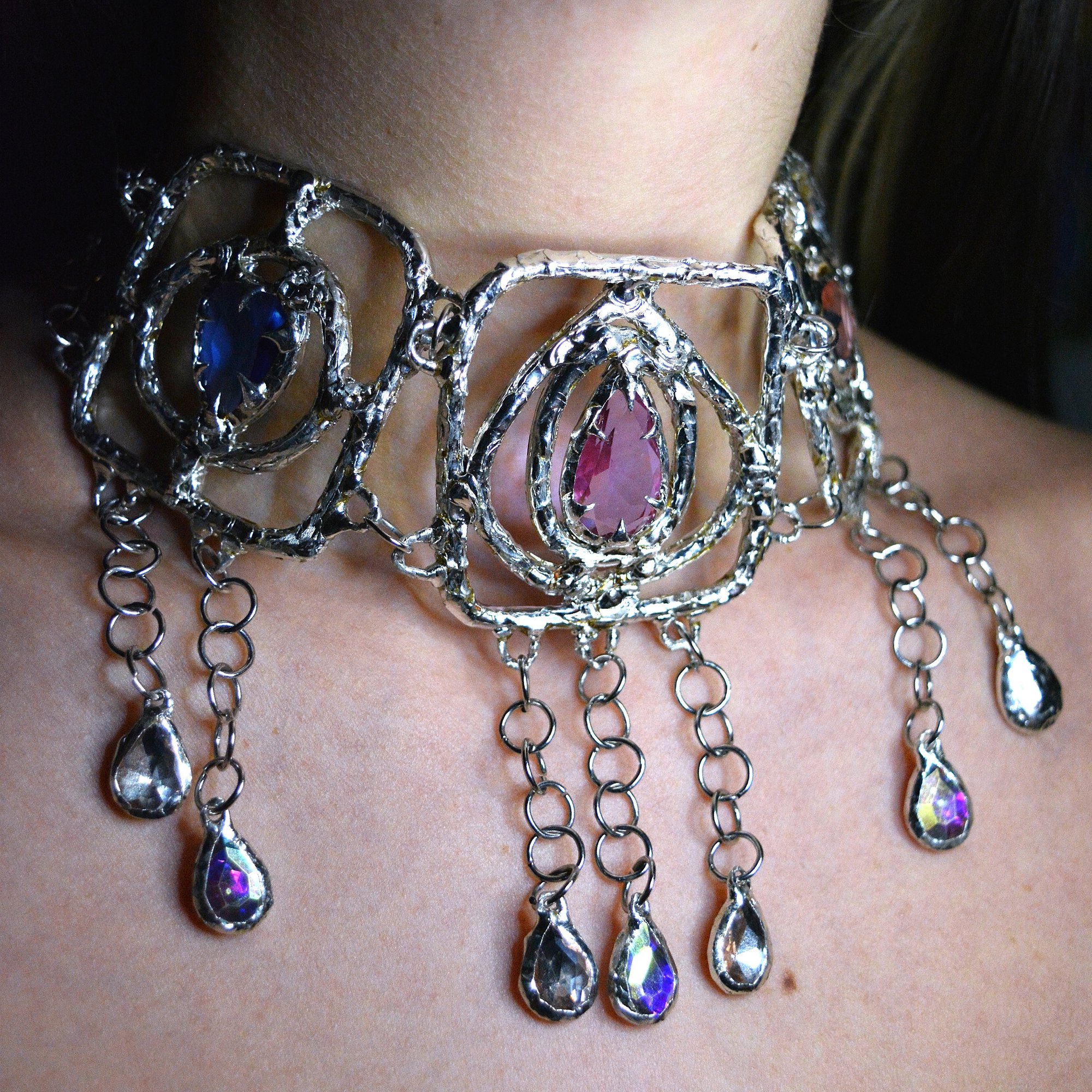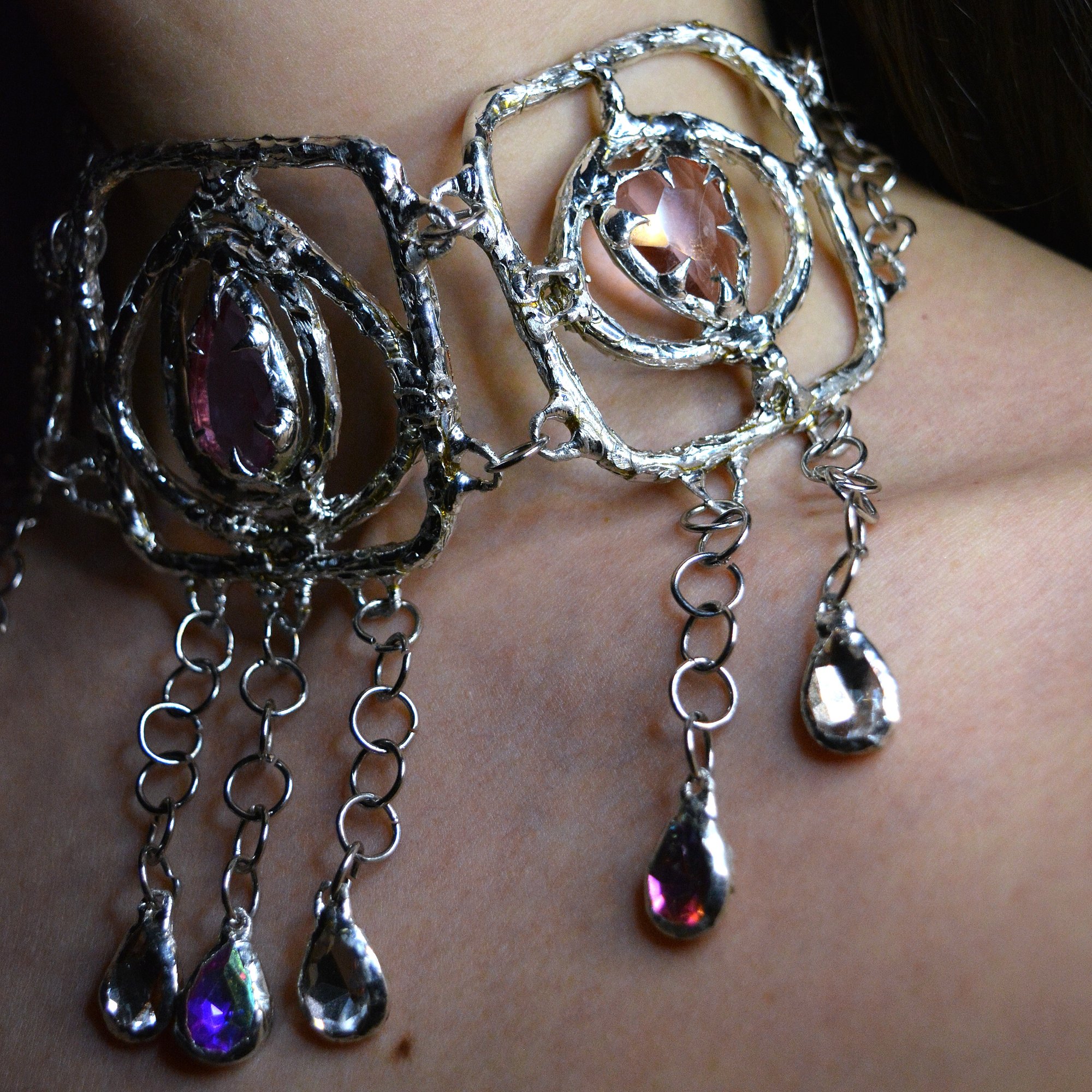 The choker’s strength is softened by a dramatic rain of chains that cascade toward the collarbone. Tipped with sparkling crystal droplets, these chains create a rhythmic shimmer that responds to every breath and movement. It is a piece that feels both like a protective shield and a shimmering veil.