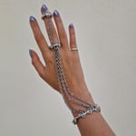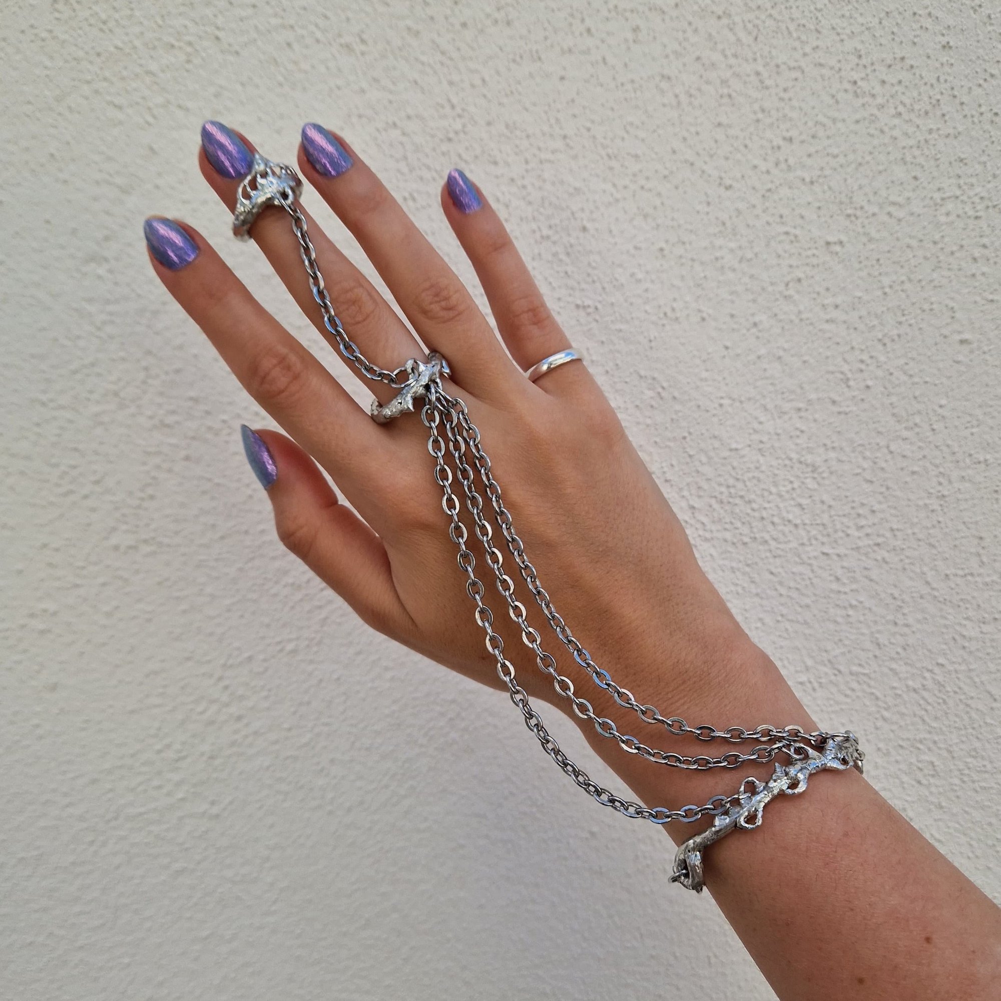 The Armour Glove bracelet captures the spirit of medieval armor with an elegant, modern design. Three chains connect to a ring that echoes the bracelet’s own texture. From this ring, a single chain leads to a half-ring, creating a dynamic balance of form and movement. A piece made for those who wear strength and style as one.