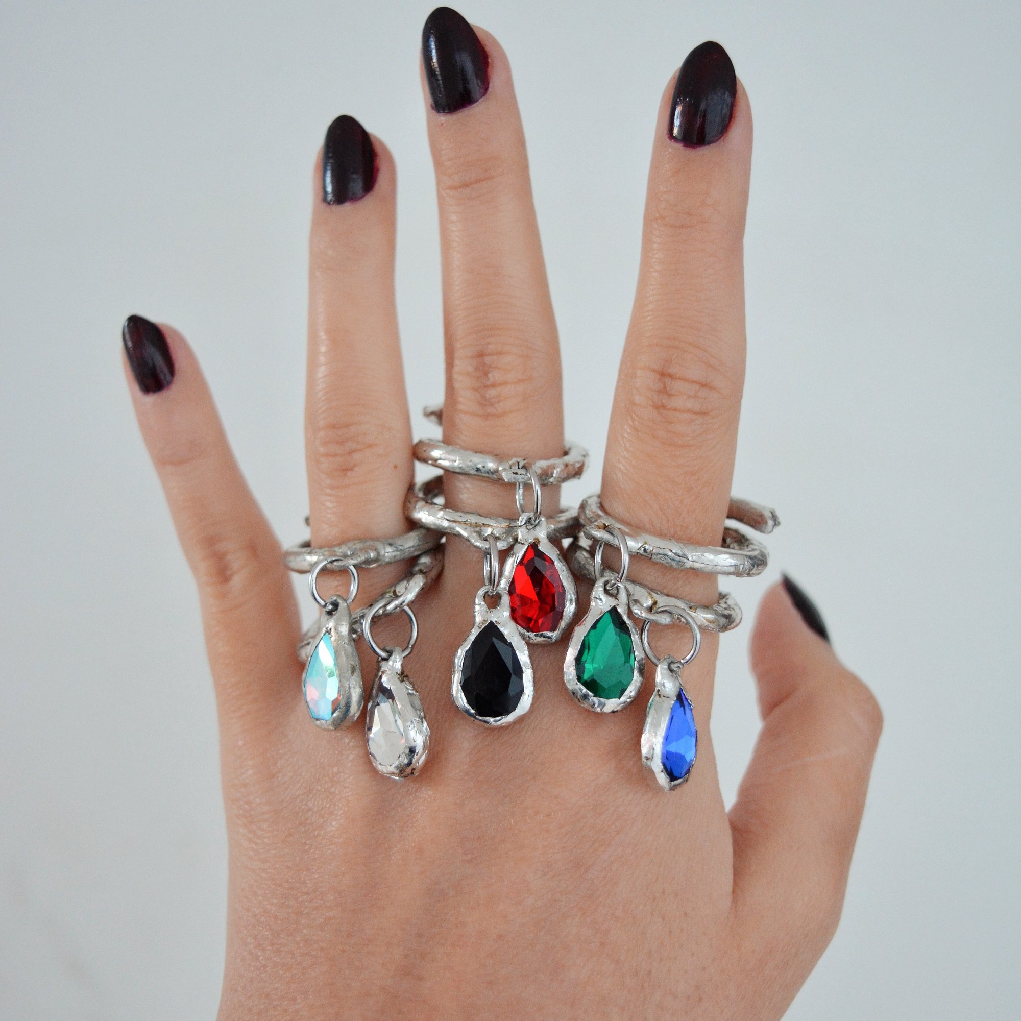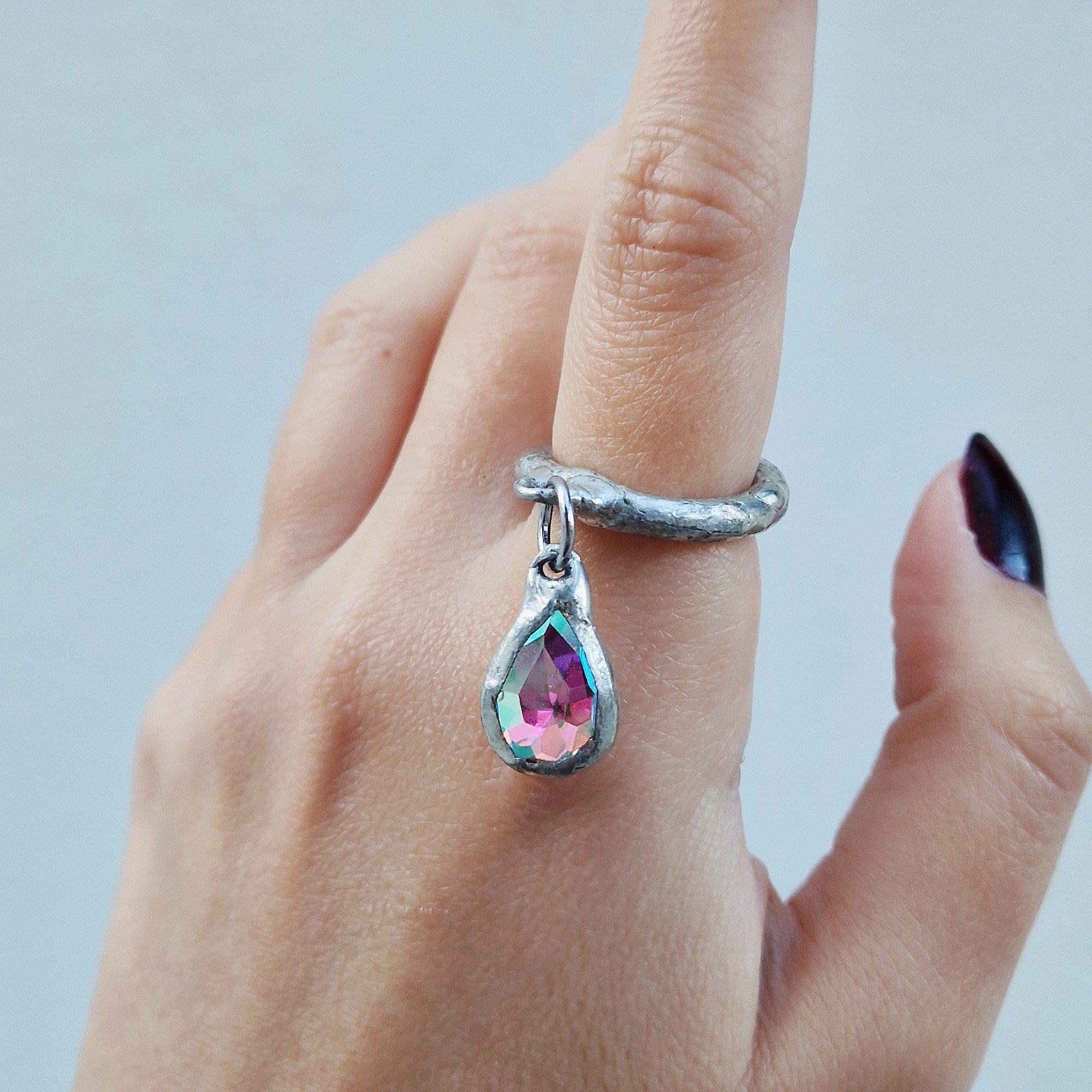 The Droplet Ring blends raw melted metal texture with a playful drop shaped crystal that swings with every movement.