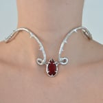 Bold, fierce, and elegantly captivating, the Thorned Choke necklace features a rigid, wavy line structure that gracefully hugs the base of the neck. Embellished with metallic thorns, this piece evokes a sense of wild beauty and strength. At its center, a teardrop-shaped red crystal adds an enchanting pop of color, symbolizing growth and renewal. A perfect blend of organic allure and modern design, this necklace is a statement of nature's raw elegance and refined power.