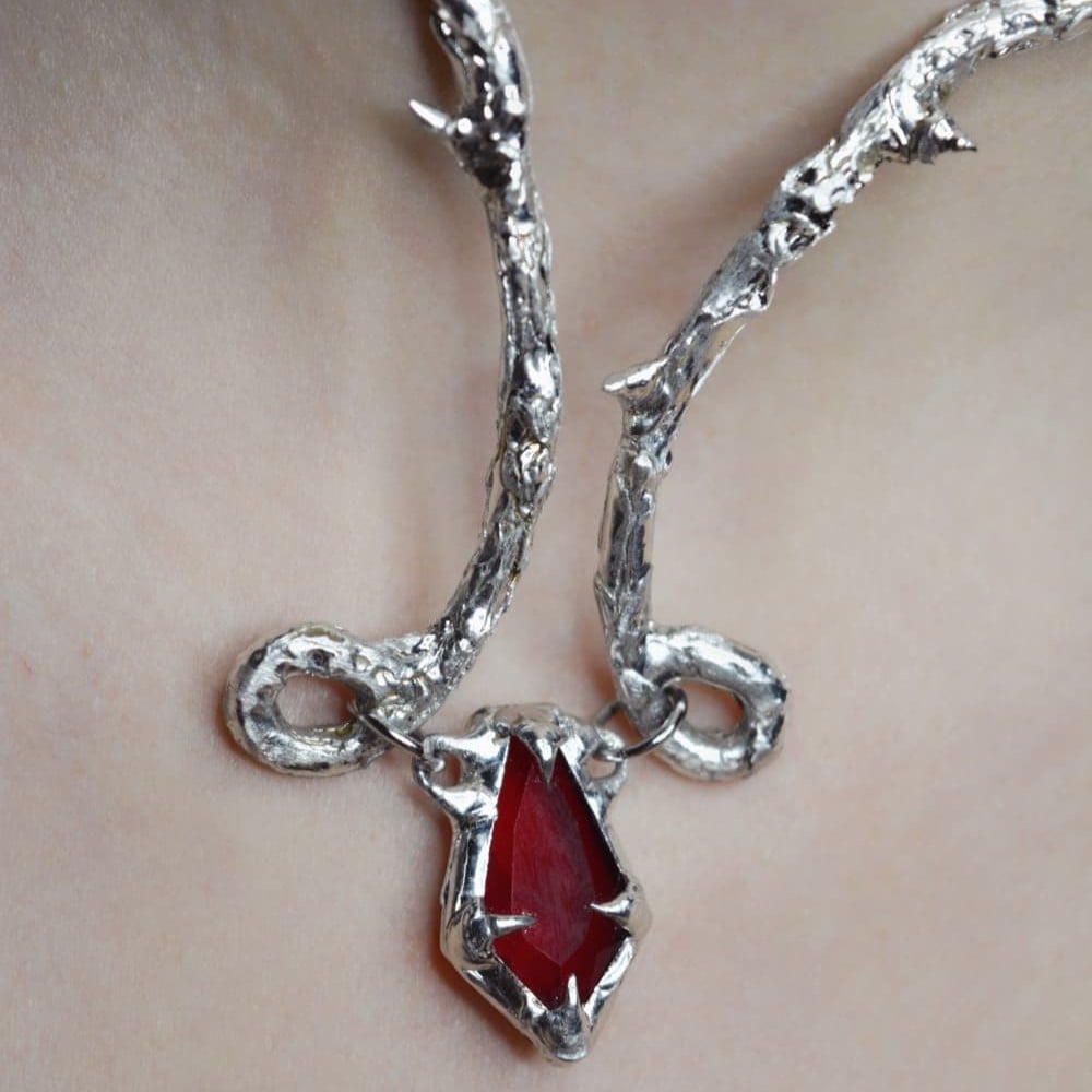Bold, fierce, and elegantly captivating, the Thorned Choke necklace features a rigid, wavy line structure that gracefully hugs the base of the neck. Embellished with metallic thorns, this piece evokes a sense of wild beauty and strength. At its center, a red crystal adds an enchanting pop of color, symbolizing growth and renewal. A perfect blend of organic allure and modern design, this necklace is a statement of nature's raw elegance and refined power.