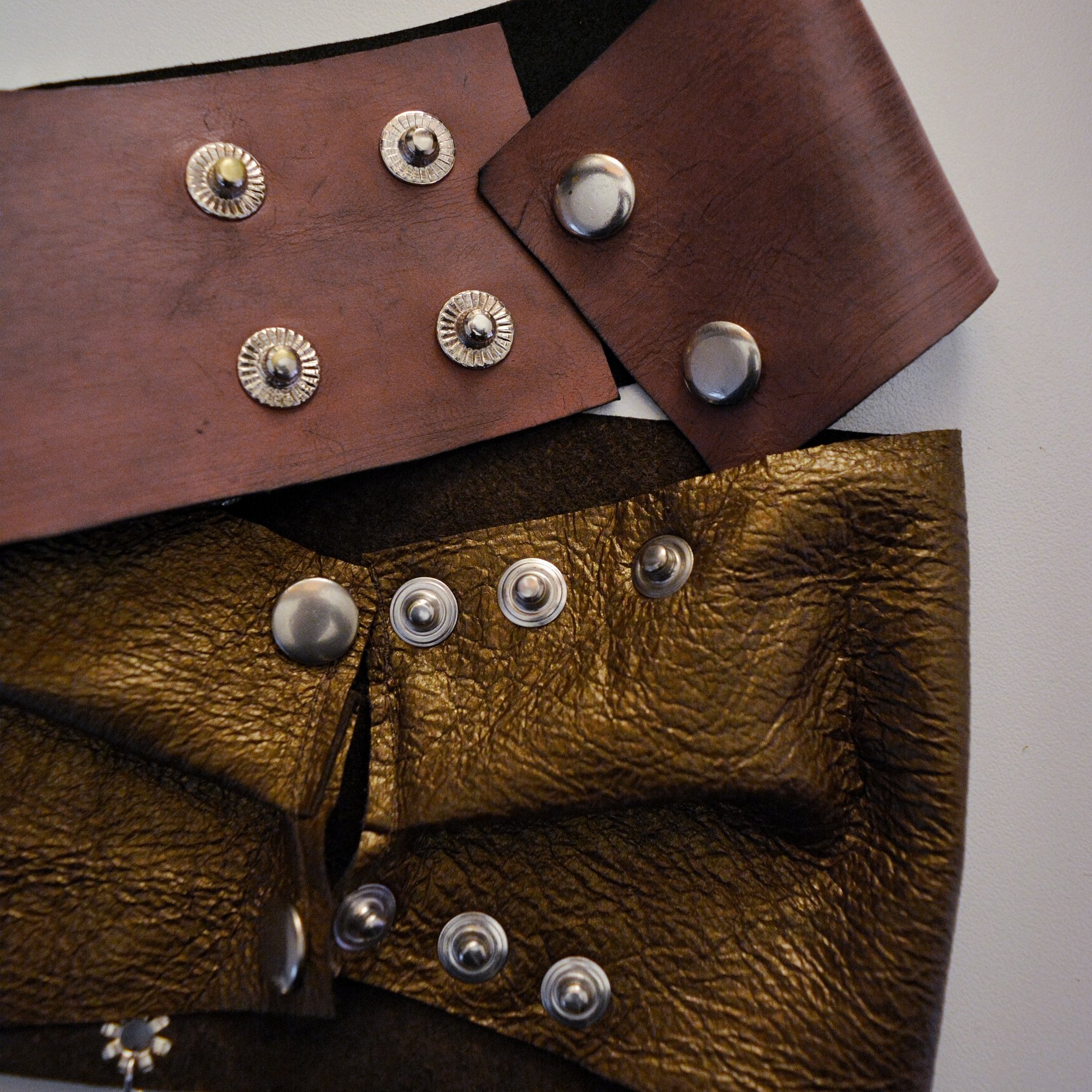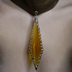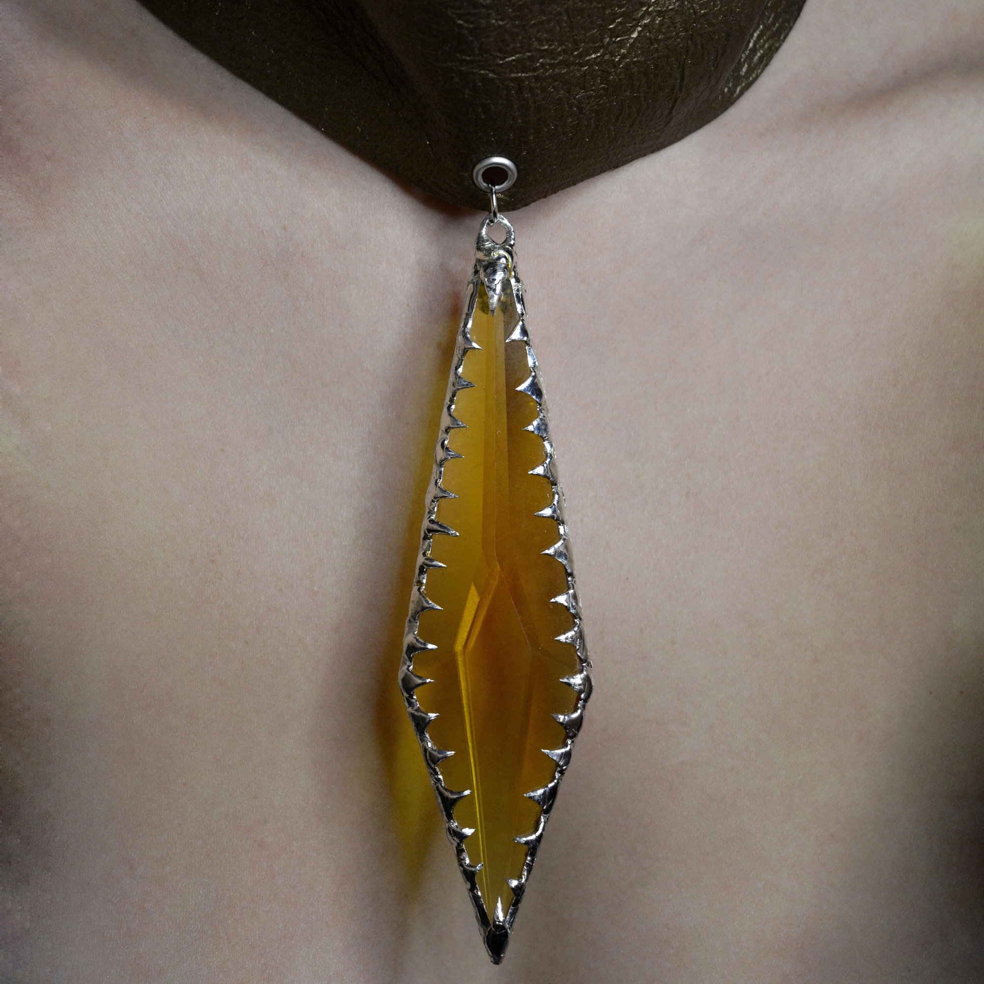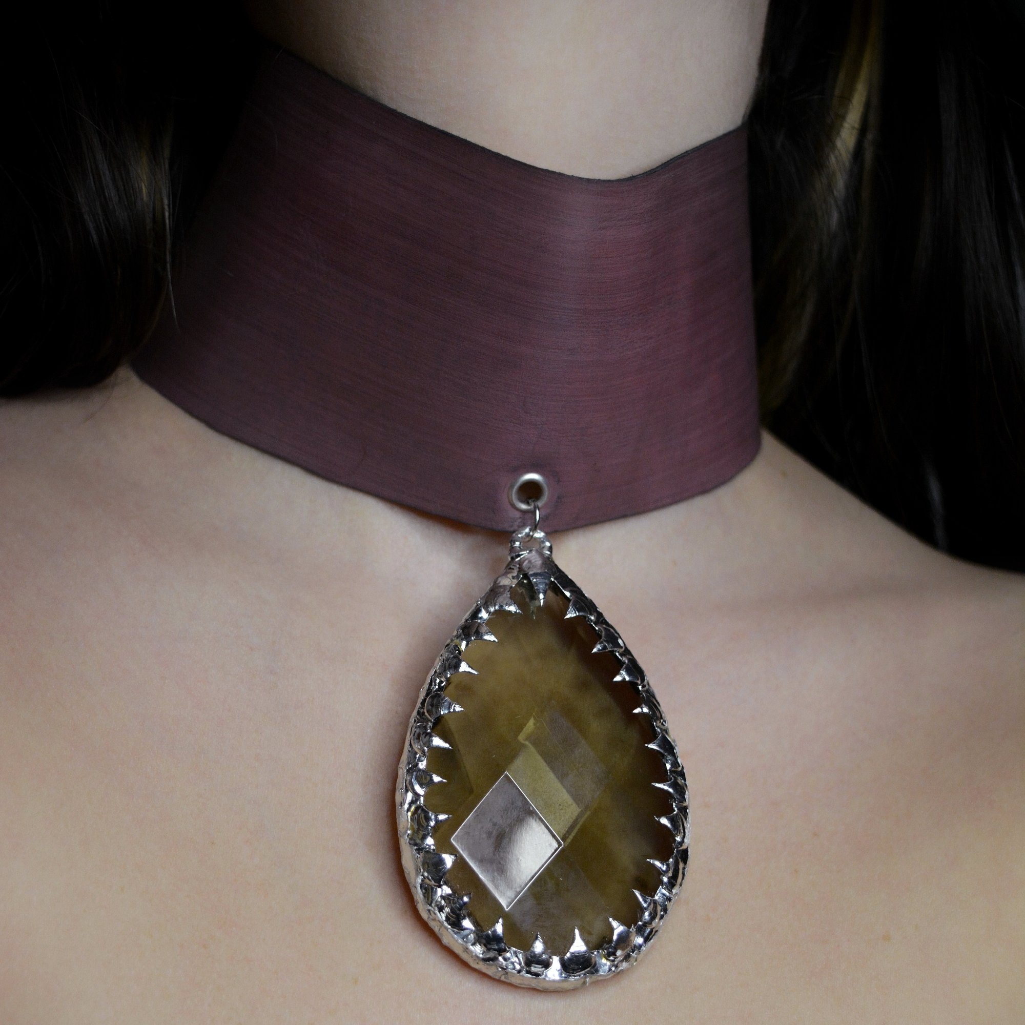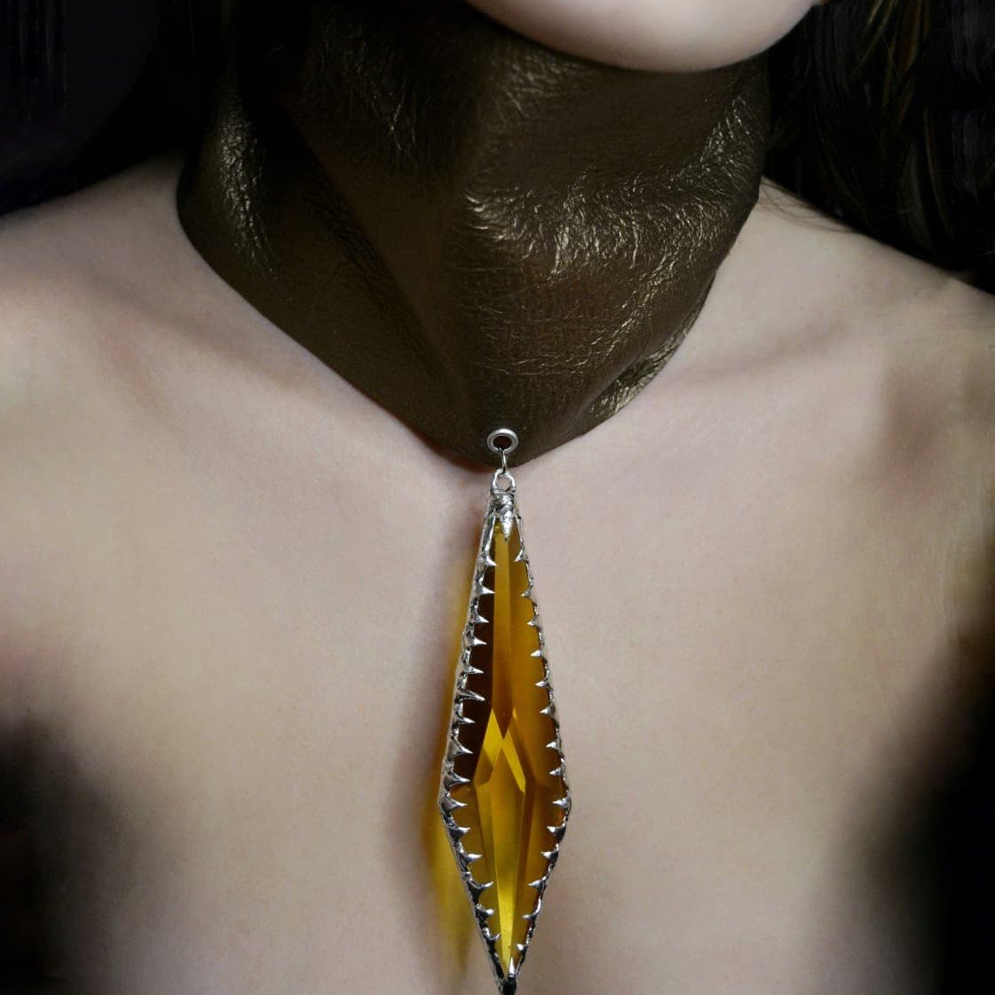 A sculptural piece that commands the silhouette. The Wrap Me Choker features a wide leather band designed to hug the entire neck, creating a statuesque, armored aesthetic. At its center sits a massive crystal pendant coated in hand molten metal.